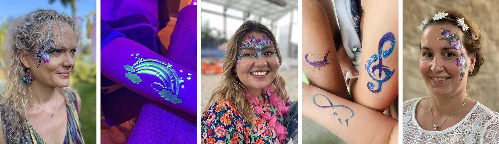 - Individuell anpassbar, ohne Wartezeiten und hautfreundlich: Designs können perfekt auf das Event abgestimmt werden. Sie werden direkt auf die Haut gesprüht, sind für alle Hauttypen geeignet und brauchen keine Trocknungszeit.
